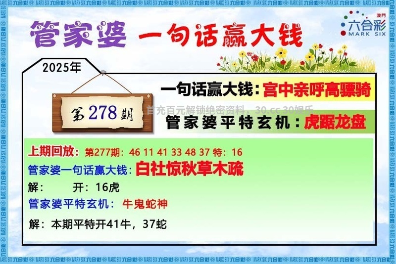 280期一句话赢大钱╠望人间三尺甘霖╣ 解料:望人间三尺甘霖解三尾和大肖的生肖牛、虎、马、羊、狗、猪。 综合:狗虎鸡马猴鼠 |